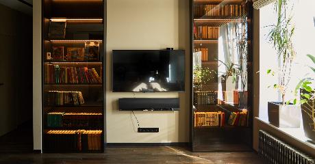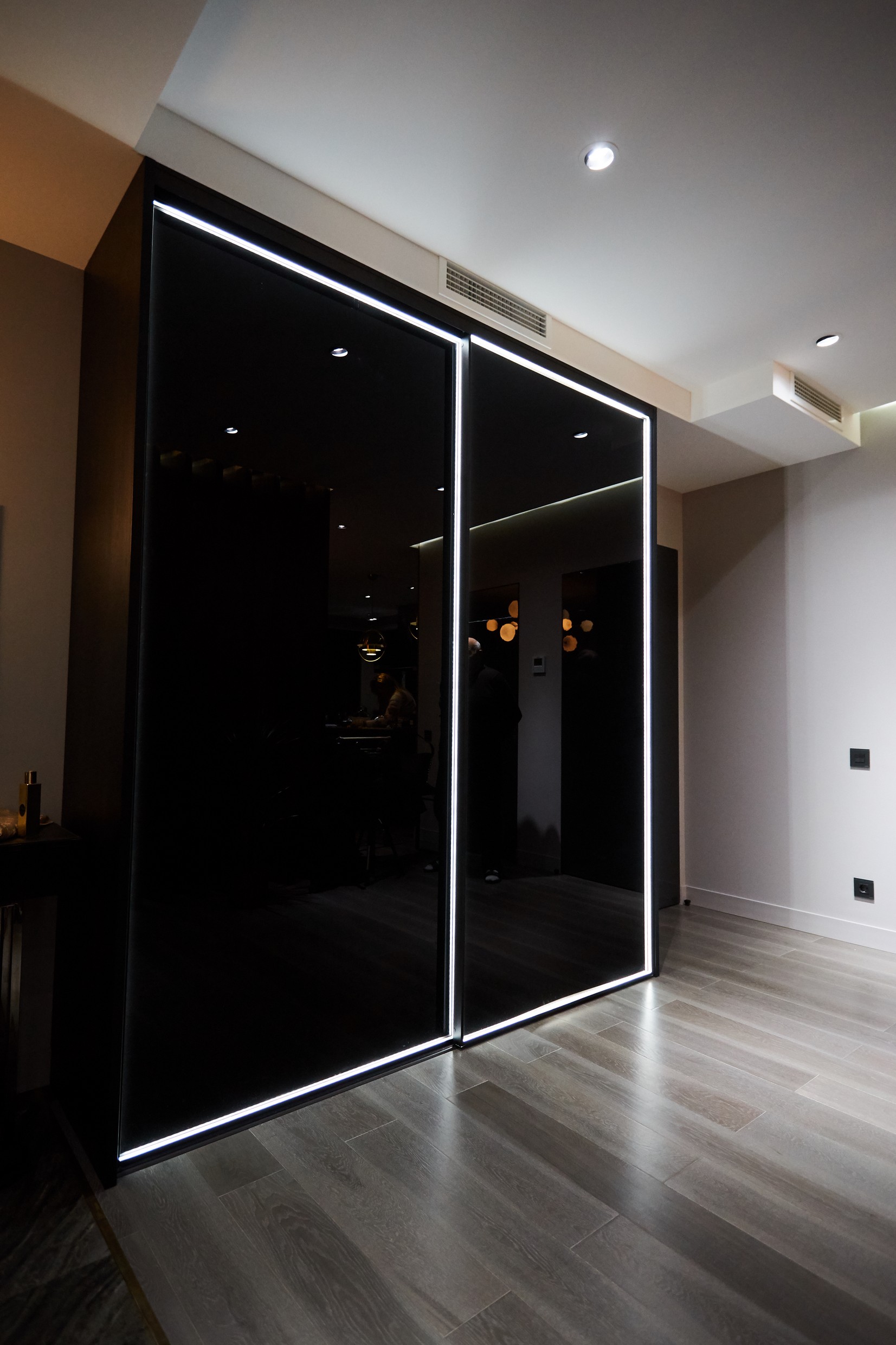 Строгие очертания шкафа-купе с фасадами, выполненными в высоком глянце, подчеркивает интегрированная в них по периметру интерьерная подсветка.