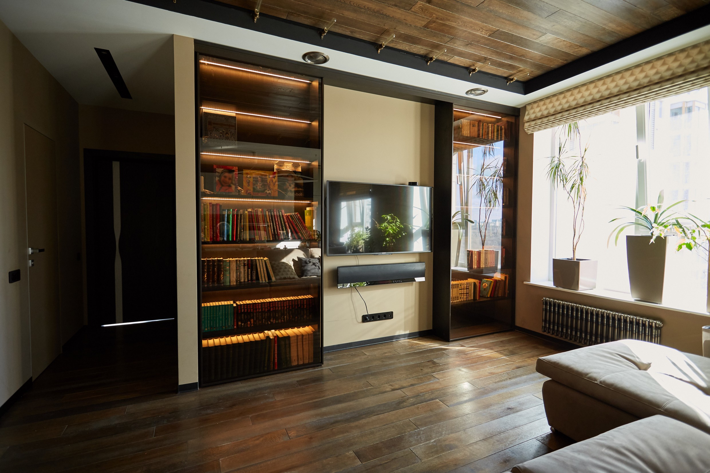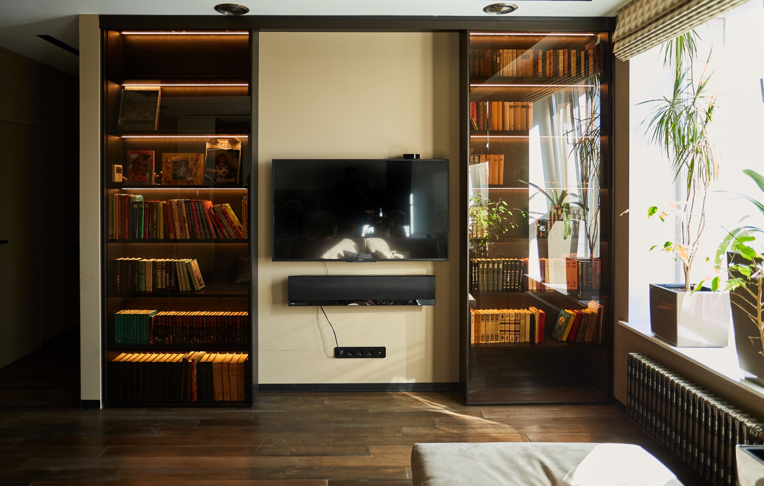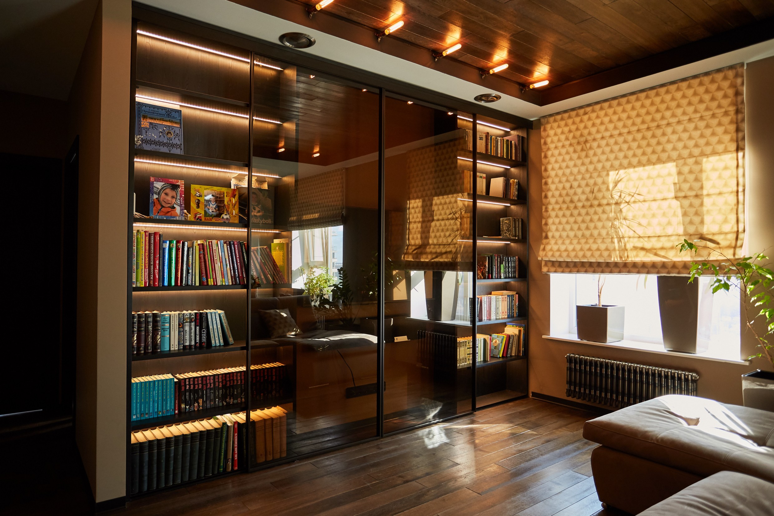 Стильная и современная гостиная в виде встроенного шкафа-купе со стеллажами для книг. Интересное и прагматичное решение. Благодаря большим дверям из тонированного стекла имеется возможность зонирования гостиной, а также уменьшить количество пыли, оседаемой на книгах и ТВ. Особый шарм и пикантность композиции добавляют расположенные в полках для книг, а также в верхнем колпаке шкафа-купе. В такой обстановке будет очень уютно просмотр любимого семейного фильма.