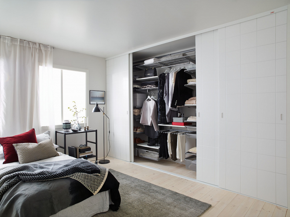 С гардеробными от Elfa легко поддерживать порядок в спальне. Встроенные шкафы-купе удобны тем, что все вещи в них находятся на своих местах, для каждого предмета одежды есть свой элемент. Благодаря этому не образуется беспорядок, вещи легко найти. Для занятых деловых людей это прекрасное решение, которое экономит время. Elfa подходит и для элегантных женских гардеробных, и для сдержанных “мужских” интерьеров. На фото спальня со встроенным шкафом-купе в стиле минимализм.